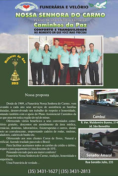Fundada em 1969, a Funerária Nossa Senhora do Carmo, ( funerária do Miltão ), traz plano Assistencial Familiar " Caminhos da Paz"' para auxiliar os familiares e oferecer total assistência funeral com um amplo convênio em uma grande rede de profissionais na área médica, farmácias, fisioterapeutas, laboratórios, dentistas e comércio em geral. Confiança não se compra, conquista! Planos de assistência familiar. Telefone.: (35) 3431-2813 - Funerária (35) 3431-1627 - Filial.: R. Geraldo Julio, 235 - Centro - Senador Amaral / MG